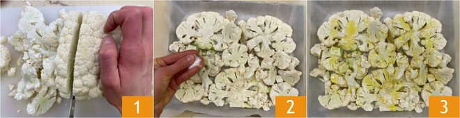 Um den überbackenen Blumenkohl mit Gewürzen zuzubereiten, beginnen Sie mit der Reinigung des Blumenkohls: Entfernen Sie die Basis und die äußeren Blätter, dann schneiden Sie ihn in dicke Scheiben, indem Sie ein scharfes Messer verwenden und versuchen, diese so intakt wie möglich zu halten 1. Legen Sie die Scheiben und die kleineren Teile nach und nach auf ein mit Backpapier ausgelegtes Backblech und würzen Sie sie gleichmäßig mit einer Prise Salz 2. Fügen Sie einen Schuss extra natives Olivenöl hinzu und achten Sie darauf, die gesamte Oberfläche des Blumenkohls gut zu benetzen 3, dann backen Sie ihn im vorgeheizten statischen Ofen bei 200 °C und backen Sie ihn etwa 10 Minuten lang, bis er leicht zart wird.
