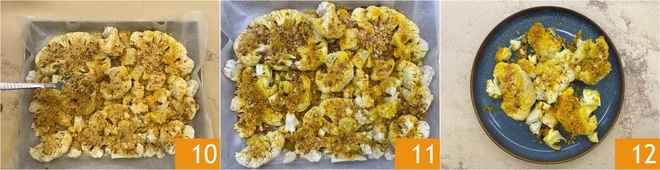 Nehmen Sie den Blumenkohl aus dem Ofen und verteilen Sie die Panade großzügig und gleichmäßig auf allen Scheiben, indem Sie einen Löffel verwenden und gut auf der Oberfläche kleben lassen 10. Stellen Sie das Blech dann wieder in den Ofen bei derselben Temperatur und setzen Sie das Backen für weitere 8–10 Minuten fort, bis der Blumenkohl innen weich und die Oberfläche gut goldbraun und knusprig ist 11. Sobald er fertig ist, nehmen Sie den überbackenen Blumenkohl mit Gewürzen aus dem Ofen und servieren Sie ihn heiß 12!