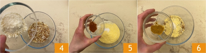 Widmen Sie sich in der Zwischenzeit der Panade: Geben Sie die Semmelbrösel zusammen mit dem geriebenen Parmigiano Reggiano in eine Schüssel 4, fügen Sie dann das Maismehl und eine Prise Salz hinzu. Geben Sie die Gewürze hinzu, beginnend mit Paprika, sowohl süß als auch scharf 5, und setzen Sie mit Curry fort 6.