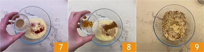 Fügen Sie der Gewürzmischung auch den Ingwer 7 und die Kurkuma 8 hinzu. Rühren Sie gut, bis eine gleichmäßige Panade entsteht 9.
