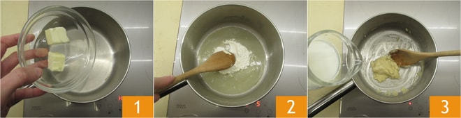 Um den überbackenen Brokkoli zuzubereiten, beginnen Sie mit der hausgemachten Béchamelsauce: Schmelzen Sie die Butter in einem Topf bei schwacher Hitze 1. Geben Sie das Mehl auf einmal hinzu 2 und kochen Sie es eine Minute lang, achten Sie darauf, dass der Boden nicht anhaftet, indem Sie mit einem Löffel rühren. Gießen Sie die Milch in drei Portionen bei Raumtemperatur hinzu 3.