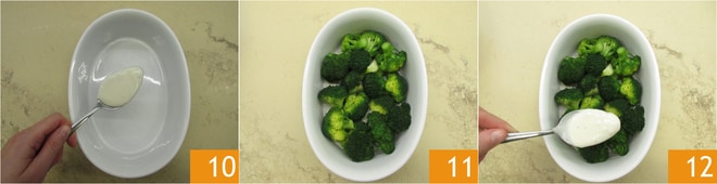 Gießen Sie etwas Béchamelsauce auf den Boden einer Auflaufform 10, fügen Sie eine erste Schicht Brokkoli hinzu 11 und mehr Béchamelsauce 12.
