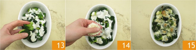 Erstellen Sie eine zweite Schicht mit dem restlichen Brokkoli 13 und der Béchamelsauce, bestreuen Sie sie mit geriebenem Käse 14. Backen Sie im vorgeheizten statischen Ofen bei 200°C für 17 Minuten, dann schalten Sie den Grill auf 230°C für 4-5 Minuten. Servieren Sie den überbackenen Brokkoli heiß 15.