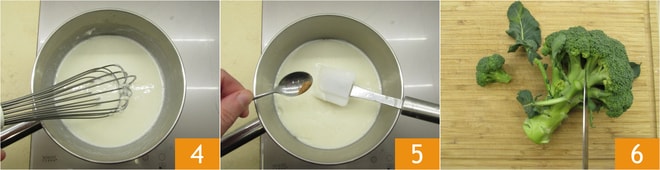 Rühren Sie weiter, bis die Sauce eindickt 4, Sie sollten eine dicke, klumpenfreie Sauce erhalten. Würzen Sie mit Salz, Pfeffer und Muskatnuss 5. Schneiden Sie den Brokkoli in Röschen 6 und waschen Sie sie.