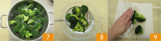 Blanchieren Sie die Röschen 6 Minuten lang in Salzwasser 7, dann lassen Sie sie in einer Schüssel mit Eiswasser abkühlen 8. Tupfen Sie den Brokkoli trocken 9.