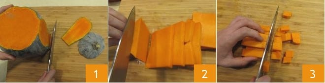 Um den gratinierten Kürbis zuzubereiten, entfernt ihr zunächst mit einem Messer die äußere Schale des Kürbisses 1. Schneidet den so gereinigten Kürbis in Scheiben 2, dann in Streifen und schließlich in etwa 1 cm große Würfel 3.