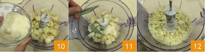 Gebt die altbackenen Brotwürfel in einen Mixer, fügt den geriebenen Grana Padano 10 und die Salbeiblätter hinzu 11 und mixt kurz, bis eine eher grobe Konsistenz erreicht ist 12.