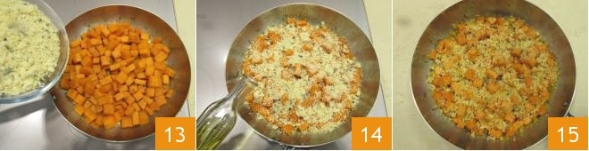 Bestreut den Kürbis mit der Panade (wenn ihr eine einfache antihaftbeschichtete Pfanne verwendet habt, gebt den Kürbis in eine mit Backpapier ausgelegte Auflaufform, andernfalls lasst ihn in derselben Pfanne) 13, fügt 2 Esslöffel extra natives Olivenöl hinzu 14 und backt ihn bei 190° im heißen Umluftofen etwa 15 Minuten lang, bis die Panade eine schöne goldene Farbe annimmt. Euer gratinierter Kürbis ist bereit zum Servieren 15!