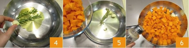 Nehmt eine Pfanne, die auch für das Backen im Ofen geeignet ist (oder verwendet eine antihaftbeschichtete Pfanne und gebt dann alles in eine Auflaufform), erhitzt das Olivenöl, fügt die Rosmarinzweige und die Knoblauchzehe hinzu 4 und lasst sie bei mittlerer Hitze 5 Minuten anbraten. Dann gebt die Kürbiswürfel hinzu 5, salzt und pfeffert nach Belieben 6 und lasst sie etwa 15 Minuten kochen, dabei gelegentlich umrühren.