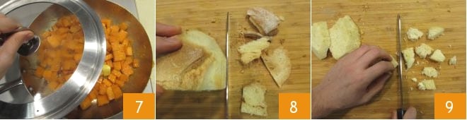 Wenn noch 5 Minuten Kochzeit übrig sind, reduziert die Hitze und deckt die Pfanne mit einem Deckel ab 7. Sobald der Kürbis gar ist, entfernt den Knoblauch und den Rosmarin aus der Pfanne. Heizt nun den Ofen auf 190° im Umluftmodus vor und macht euch an die Zubereitung der Panade: nehmt das altbackene Brot, entfernt die Kruste mit einem Messer 8 und schneidet die Krume in Würfel 9: ihr benötigt 50 g davon.