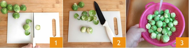 Um den gratinierten Rosenkohl zuzubereiten, reinigen Sie zunächst den Rosenkohl, indem Sie den Strunk mit einem Messer entfernen 1 und eventuell beschädigte Blätter abzupfen 2. Spülen Sie sie unter kaltem Wasser ab 3 und trocknen Sie sie mit einem Küchentuch.