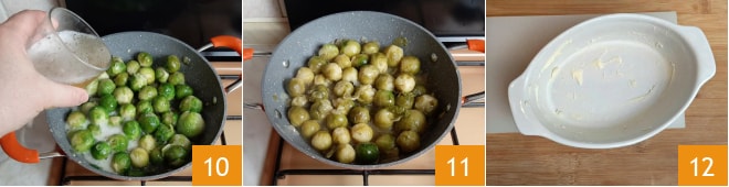 Nun fügen Sie das helle Bier vorsichtig hinzu 10, lassen es verdampfen und schmoren Sie den Rosenkohl bei mittlerer bis niedriger Hitze, bis die Flüssigkeit etwas reduziert ist, aber nicht völlig trocken 11. Fetten Sie eine Ofenform mit Butter ein 12.