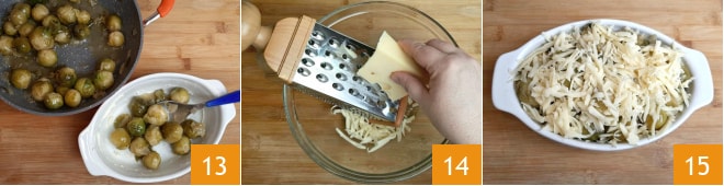 Geben Sie hier den gegarten Rosenkohl hinein 13. Reiben Sie den Gruyère mit der groben Seite der Reibe 14, bedecken Sie ihn mit reichlich Käse 15 und backen Sie ihn im vorgeheizten Umluftofen bei 180° für 8-10 Minuten.