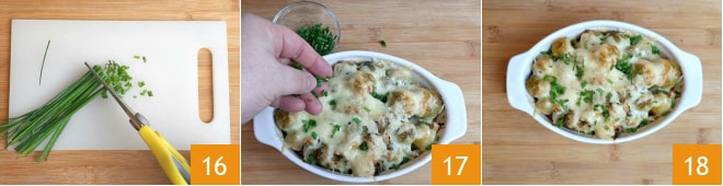 In der Zwischenzeit schneiden Sie mit der Küchenschere den Schnittlauch 16. Wenn der Rosenkohl schön gratiniert ist, nehmen Sie ihn aus dem Ofen, würzen Sie ihn mit dem Schnittlauch 17 und servieren Sie ihn heiß und schmelzend 18.
