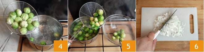 Füllen Sie einen Topf mit Wasser und bringen Sie es zum Kochen. Dann geben Sie den Rosenkohl hinein 4, ohne ihn zu weich werden zu lassen. Er sollte „al dente“ bleiben, um später in der Pfanne und im Ofen weiter zu garen. Gießen Sie ihn ab 5 und stellen Sie ihn beiseite. Schälen Sie die Zwiebel und hacken Sie sie mit einem Messer 6.
