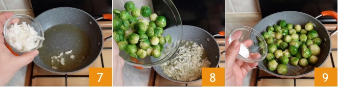 Geben Sie das Öl in eine Antihaftpfanne, fügen Sie die Zwiebel hinzu 7 und lassen Sie sie sanft anbraten. Sobald sie goldgelb ist, geben Sie den Rosenkohl hinzu 8, würzen Sie mit Salz 9 und Pfeffer, vermischen Sie alles und lassen Sie es 2-3 Minuten ziehen.