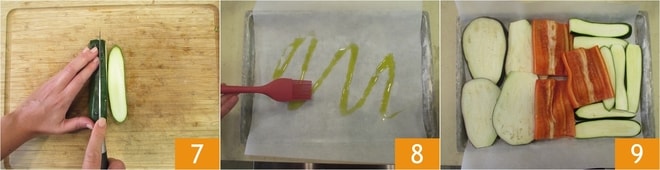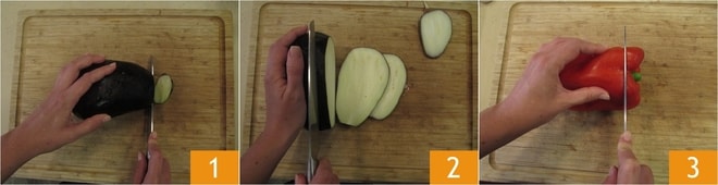 Um das im Ofen gratinierte Gemüse zuzubereiten, waschen Sie zuerst das Gemüse. Nehmen Sie die Aubergine, schneiden Sie die Enden ab 1 und schneiden Sie sie der Länge nach in 7-8 mm dicke Scheiben 2. Nehmen Sie die Paprika, entfernen Sie den oberen Deckel 8 und die inneren Samen.