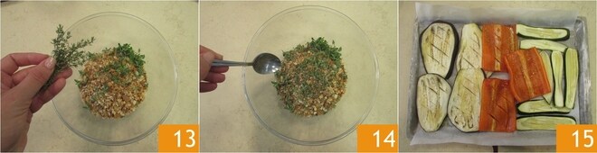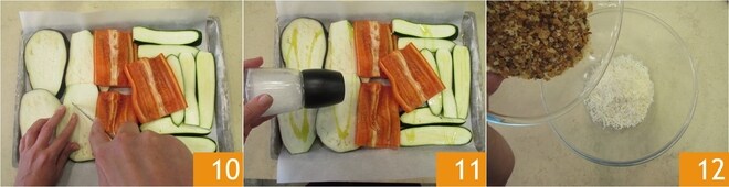 Ritzen Sie das Gemüse mit einem Messer ein 10 und würzen Sie es mit Salz und Öl 11. Backen Sie es im vorgeheizten statischen Ofen bei 180° auf der mittleren Schiene für 30 Minuten. In der Zwischenzeit bereiten Sie die Panade vor. In einer Schüssel den geriebenen Käse mit grob geriebenem Brot 12 mischen.