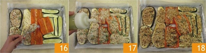 Die Panade darüber geben 16 und mit etwas Öl 17 beträufeln. Für weitere 10-12 Minuten bei 180° backen, dann das Blech in den oberen Teil des Ofens schieben und den Grill für ein paar Minuten einschalten, bis sie schön goldbraun sind. Aus dem Ofen nehmen 18 und das gratinierte Ofengemüse servieren.
