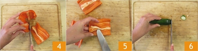 Teilen Sie ihn in 3 große Stücke 4 und entfernen Sie die inneren Fäden 5, drücken Sie sie dann leicht flach. Schneiden Sie die Enden der Zucchini ab 6.