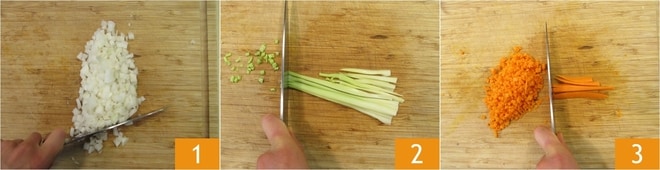 Um die Berglasagne vorzubereiten, beginnen Sie mit dem Wurst-Ragù: Schälen und hacken Sie die Zwiebel fein 1, den Sellerie 2 und die Karotte 3.