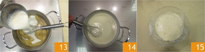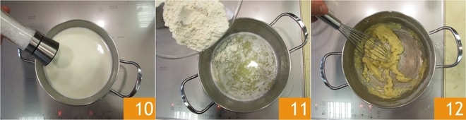 Gießen Sie etwas heiße Milch 13 ein, rühren Sie um, und gießen Sie den Rest der Milch ein. Kochen Sie die Béchamel-Sauce etwa 5-6 Minuten 14, bis sie eindickt. Lassen Sie sie bei Raumtemperatur mit Frischhaltefolie bedeckt 15.