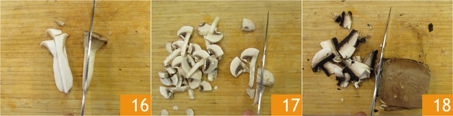 Bereiten Sie die Pilze vor: Kratzen Sie die erdigsten Teile der Pilze mit einem kleinen Messer ab. Schneiden Sie die Pfifferlinge in Scheiben 16 und machen Sie dasselbe mit den Champignons 17 und den Portobellos 18.