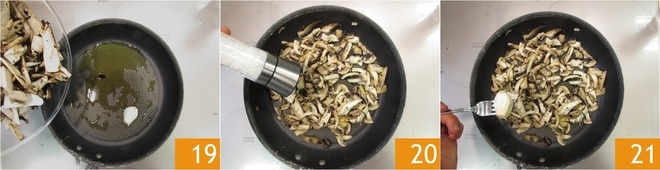 Erhitzen Sie etwas Olivenöl in einer großen Pfanne. Fügen Sie die Knoblauchzehe hinzu, um Geschmack zu geben. Geben Sie die Pilze hinzu 19 und braten Sie sie 2-3 Minuten oder bis sie gar sind. Salzen 20 und entfernen Sie die Knoblauchzehe 21.