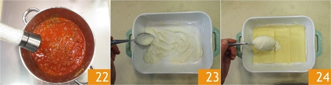 In der Zwischenzeit wird das Ragù auch fertig sein 22, abschmecken. Nehmen Sie eine rechteckige Ofenform (Maße 24 x 17 x 6), geben Sie eine dünne Schicht Béchamel-Sauce auf den Boden 23, legen Sie 3 Blätter Eierteig leicht überlappend darauf, fügen Sie eine weitere Schicht Béchamel-Sauce hinzu 24.