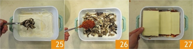 Nun einen Teil der Pilze hinzugeben 25, dann eine Schicht Ragù 26 und eine Schicht Teig 27. Setzen Sie das Schichten der Lasagne fort, bis alle Zutaten aufgebraucht sind und vier Schichten entstehen.