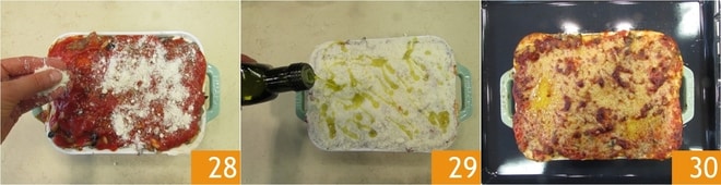 Das Ragù der letzten Schicht mit geriebenem Parmigiano Reggiano DOP bedecken 28. Mit einem Schuss Öl beträufeln 29. Im statischen Ofen bei 200 Grad 25 Minuten backen, am Ende die Grillfunktion für 5 Minuten einstellen, um die Oberfläche zu gratinieren. Aus dem Ofen nehmen 30 und die Berglasagne vor dem Servieren etwas abkühlen lassen.