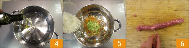 Erhitzen Sie etwas Öl in einem Topf 4 und bereiten Sie das Soffritto zu 5. Lassen Sie es 6-7 Minuten bei mittlerer Hitze köcheln und rühren Sie gelegentlich um. Entfernen Sie die Haut von der Wurst 6.