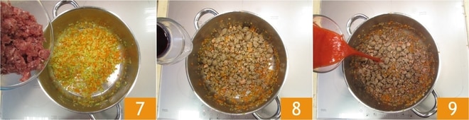 Fügen Sie die zerbröselte Wurst hinzu 7 und braten Sie sie etwa 5 Minuten bei mittlerer Hitze an, dabei häufig umrühren. Mit Rotwein ablöschen 8 und verdampfen lassen. Dann die Tomatenpassata hinzufügen 9, salzen und das Ragù etwa 1 Stunde bei mittlerer bis niedriger Hitze köcheln lassen, bis es eine leicht flüssige Konsistenz erreicht.