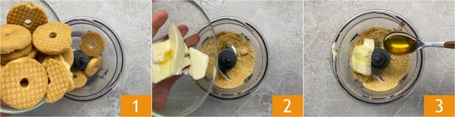 Um die Ricotta- und Himbeerbecher zuzubereiten, geben Sie zunächst die Kekse in einen Mixer 1 und mixen Sie sie, bis ein Pulver entsteht. Fügen Sie die weiche Butter 2 und den Honig 3 hinzu.