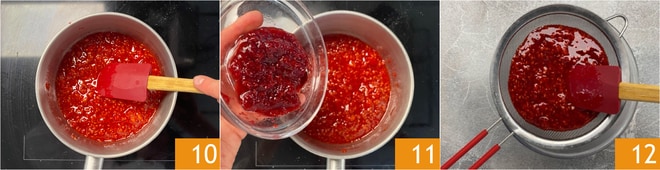 Kochen Sie bei niedriger Hitze unter ständigem Rühren 10, bis die Himbeeren zerfallen sind, dies dauert etwa 5 Minuten. Fügen Sie die Himbeerkonfitüre hinzu 11 und rühren Sie ein letztes Mal, um die Zutaten zu vermischen. Passieren Sie die Mischung durch ein feines Sieb, um die Himbeersamen zu entfernen 12, und lassen Sie sie vollständig abkühlen.