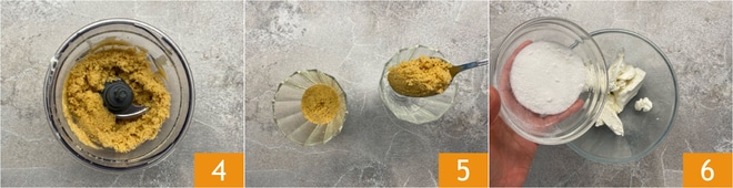 Mixen Sie erneut, bis eine sandige Mischung entsteht 4. Verteilen Sie die Keksmasse auf dem Boden von 4 Bechern mit einem Fassungsvermögen von 200 ml 5, glätten Sie die Oberfläche und lassen Sie sie im Kühlschrank für mindestens 30 Minuten fest werden. In der Zwischenzeit geben Sie die Ricotta und den Zucker in eine Schüssel 6.
