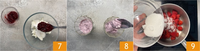 Fügen Sie die Himbeerkonfitüre hinzu 7 und mischen Sie, bis eine homogene Creme entsteht. Nehmen Sie die Becher und füllen Sie sie mit der Creme 8, glätten Sie die Oberfläche und stellen Sie sie erneut für mindestens 20 Minuten in den Kühlschrank. In der Zwischenzeit bereiten Sie das Himbeer-Coulis zu: Geben Sie die Himbeeren und den Zucker in einen kleinen Topf 9.
