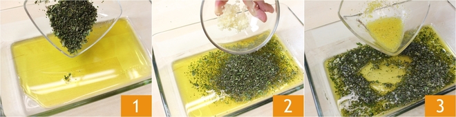 Um den Schwertfisch im Päckchen zuzubereiten, beginnen Sie mit der Marinade: Gießen Sie in eine große Schüssel das Olivenöl und die gehackten Kräuter 1, wobei Sie darauf achten, einen Esslöffel für das Päckchen beiseite zu lassen. Fügen Sie den gehackten Knoblauch 2 und den Saft einer halben Zitrone zusammen mit dem abgeriebenen Zitronenschale 3 hinzu.