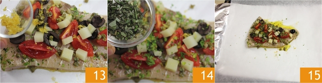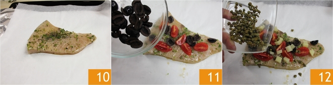 Bereiten Sie auf einem Backblech alles für das Päckchen vor: Legen Sie ein Blatt Alufolie aus, darüber ein Blatt Backpapier und legen Sie eine der beiden Schwertfischscheiben, die Sie aus der Marinade genommen haben, in die Mitte 10. Beginnen Sie, den Fisch mit dem geschnittenen Gemüse, den Oliven 11 und den gewaschenen und ausgedrückten Kapern 12 zu würzen.