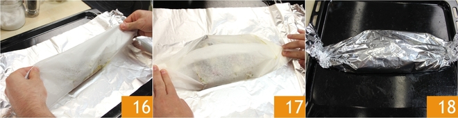 Heizen Sie den Ofen auf 200°C vor, schließen Sie die Päckchen, indem Sie zuerst das Backpapier in der Mitte falten 16 und die Seiten umklappen 17, und verfahren Sie gleich mit dem Alufolienblatt 18. Backen Sie für mindestens 25 Minuten, überprüfen Sie den Gargrad des Schwertfisches (abhängig von der Dicke Ihrer Scheibe, falls nötig, lassen Sie ihn weitere 5 Minuten im Ofen) und holen Sie ihn dann aus dem Ofen und legen Sie ihn auf zwei Teller mit dem eigenen Kochfond!