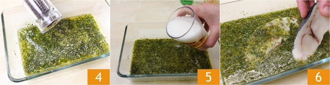Salzen und pfeffern Sie 4 und fügen Sie schließlich das Doppelmalzbier 5 hinzu. Tauchen Sie die Schwertfischscheiben in die Marinade 6 und lassen Sie sie mindestens eine Stunde oder, wenn Sie es im Voraus zubereiten möchten, die ganze Nacht ruhen.