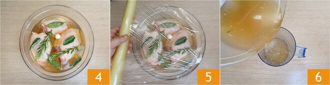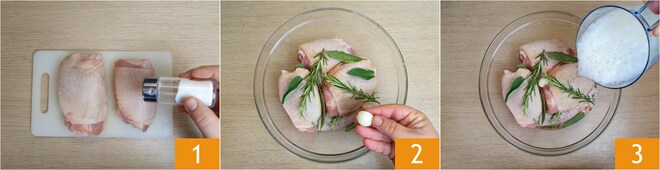 Um das Bierhähnchen zuzubereiten, nehmen Sie zunächst die Hähnchenschenkel und entfernen Sie eventuelle Fettstücke. Massieren Sie sie mit Salz 1, auf beiden Seiten, und bestreuen Sie sie mit gemahlenem Pfeffer. Legen Sie die Hähnchenschenkel in eine große Schüssel und fügen Sie auch Rosmarin, Lorbeerblätter, Salbeiblätter und eine Knoblauchzehe hinzu 2. Gießen Sie das Bier hinzu 3,