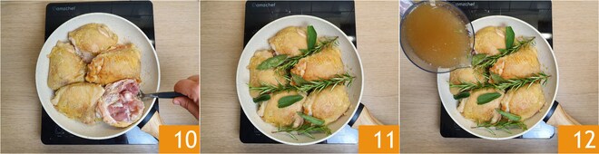 Braten Sie sie für ein paar Minuten an, auf beiden Seiten 10. Fügen Sie den Rosmarin, den Salbei und das Lorbeerblatt aus der Marinade hinzu und gießen Sie das Bier hinzu 12.