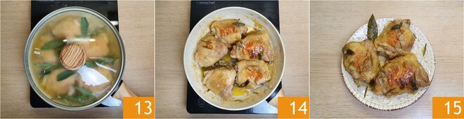 Reduzieren Sie die Hitze auf mittlere Stufe, decken Sie mit einem Deckel ab 13 und setzen Sie das Kochen für 40 Minuten fort. Nach dieser Zeit den Deckel abnehmen und das Huhn auf die andere Seite drehen. Lassen Sie die Soße für 10 Minuten, bei starker Hitze und ohne Deckel, eindicken und braten Sie das Huhn, um eine schöne goldene Kruste zu erhalten 14. Servieren Sie es mit der Beilage Ihrer Wahl: Ofenkartoffeln sind immer eine gute Wahl 15!