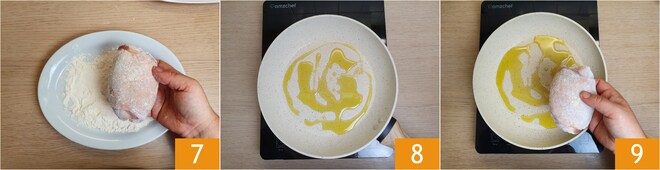 Nehmen Sie die Hähnchenschenkel wieder auf und wälzen Sie sie leicht in Mehl 7, auf beiden Seiten, und schütteln Sie leicht, um überschüssiges Mehl zu entfernen. Nehmen Sie eine ziemlich große Pfanne, die das Huhn in einer einzigen Schicht aufnehmen kann, und erhitzen Sie 4 Esslöffel Öl 8. Fügen Sie die Hähnchenschenkel in das heiße Öl ein, mit der Hautseite nach unten 9.