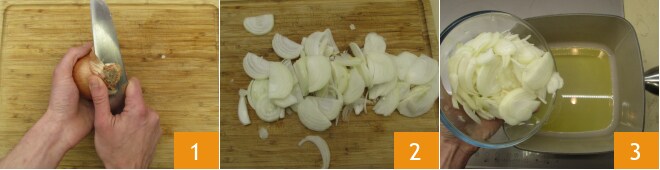 Um die Haxe mit Bier zuzubereiten, beginnt ihr mit dem Schälen der Zwiebeln 1, schneidet sie nicht zu dünn 2 und gebt sie in einen breiten Topf mit hohem Rand und einem Boden aus Öl 3.