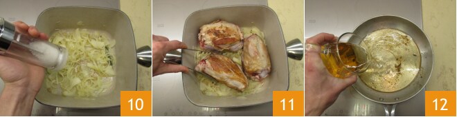 Die Zwiebeln mit Salz abschmecken 10 und die angebratenen Haxen dazugeben 11. Entfernt das überschüssige Fett in der Pfanne, in der ihr das Fleisch angebraten habt, und löscht den Bratensatz mit dem Bier ab 12.
