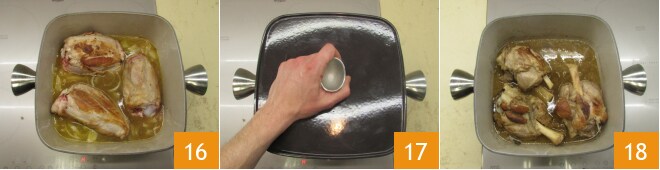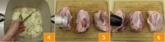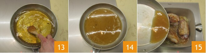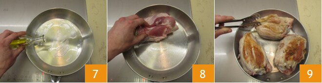 Gießt etwas Öl in eine Stahlpfanne 7 und bratet die Haxen bei mittlerer bis hoher Hitze zuerst auf einer Seite 8 und dann auf der anderen 9 an: Denkt daran, dass es immer ratsam ist, die Fleischstücke mit einer Zange oder Holzlöffeln zu wenden.