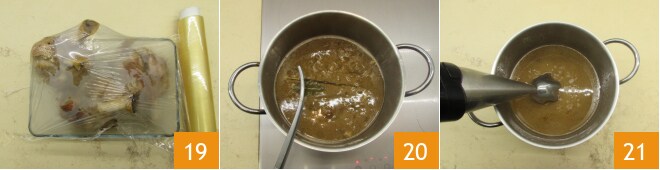 Nach Ablauf der Garzeit das Fleisch in einen Behälter legen und mit Frischhaltefolie abdecken, damit es nicht austrocknet 19. Entfernt Lorbeer und Rosmarin aus dem Bratensaft 20 und püriert die Sauce mit einem Stabmixer 21.