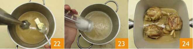 Während ihr diese Operation durchführt, gebt auch die kalte Butter in Stücken hinzu, damit sie sich nicht von der Sauce trennt 22 und lasst sie sich einarbeiten. Gegebenenfalls mit Salz abschmecken 23 und mit dem Fleisch wieder zusammenfügen. So macht man die Haxe mit Bier, genießt sie heiß 24.